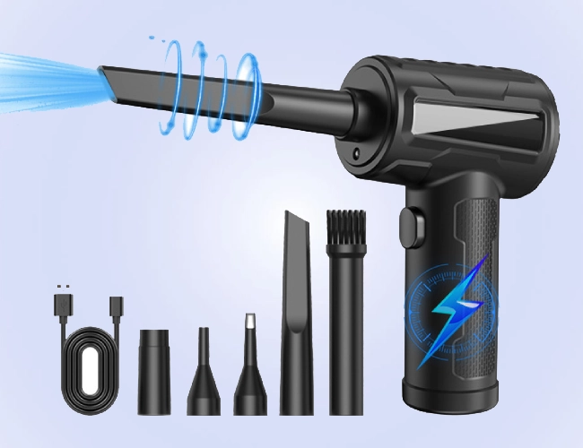 Mit dem leistungsstarken, USB-betriebenen Motor lassen sich selbst die hartnäckigsten Staubpartikel wegblasen.